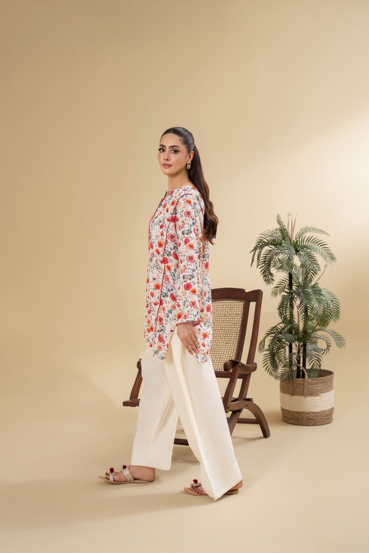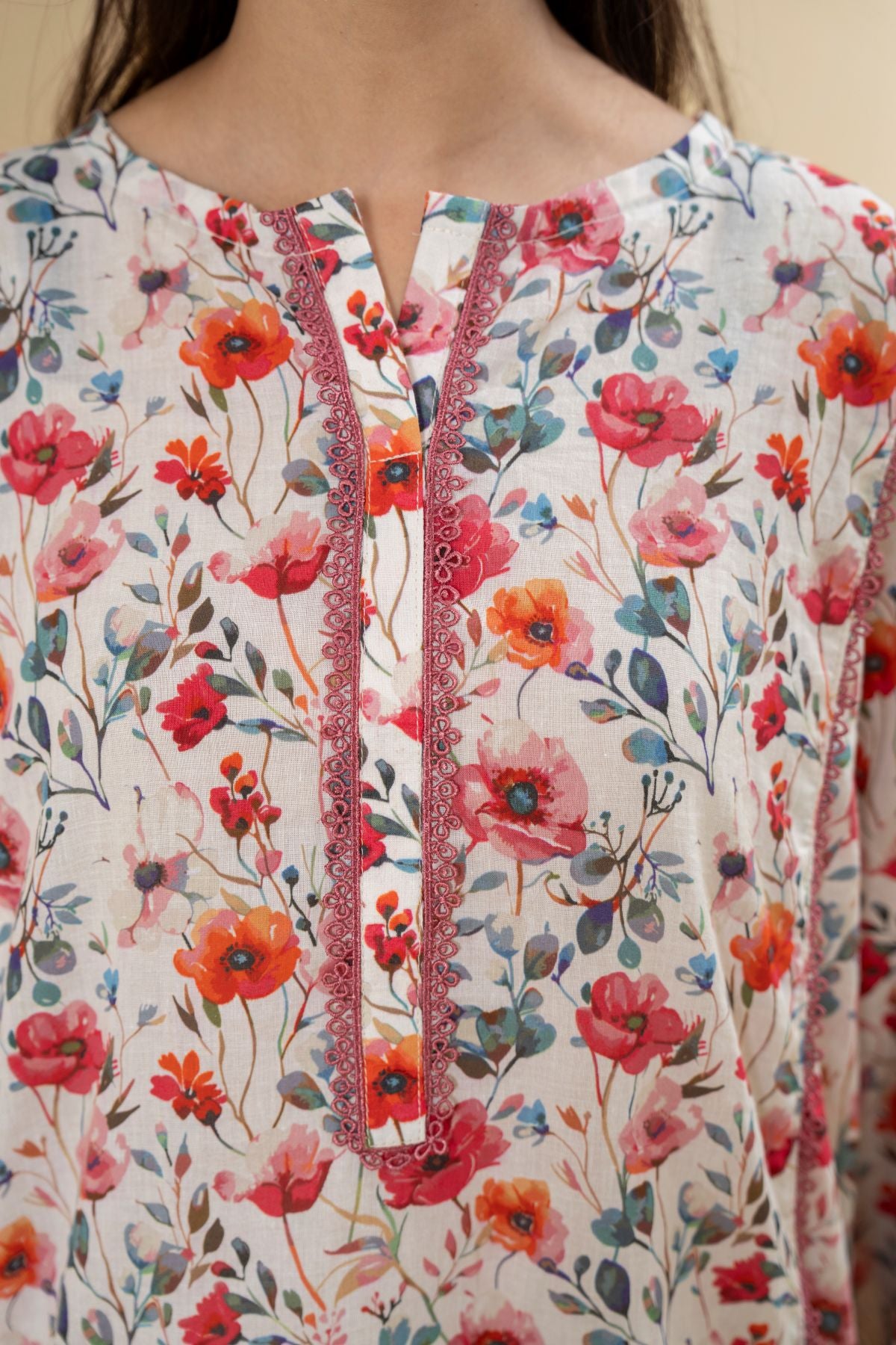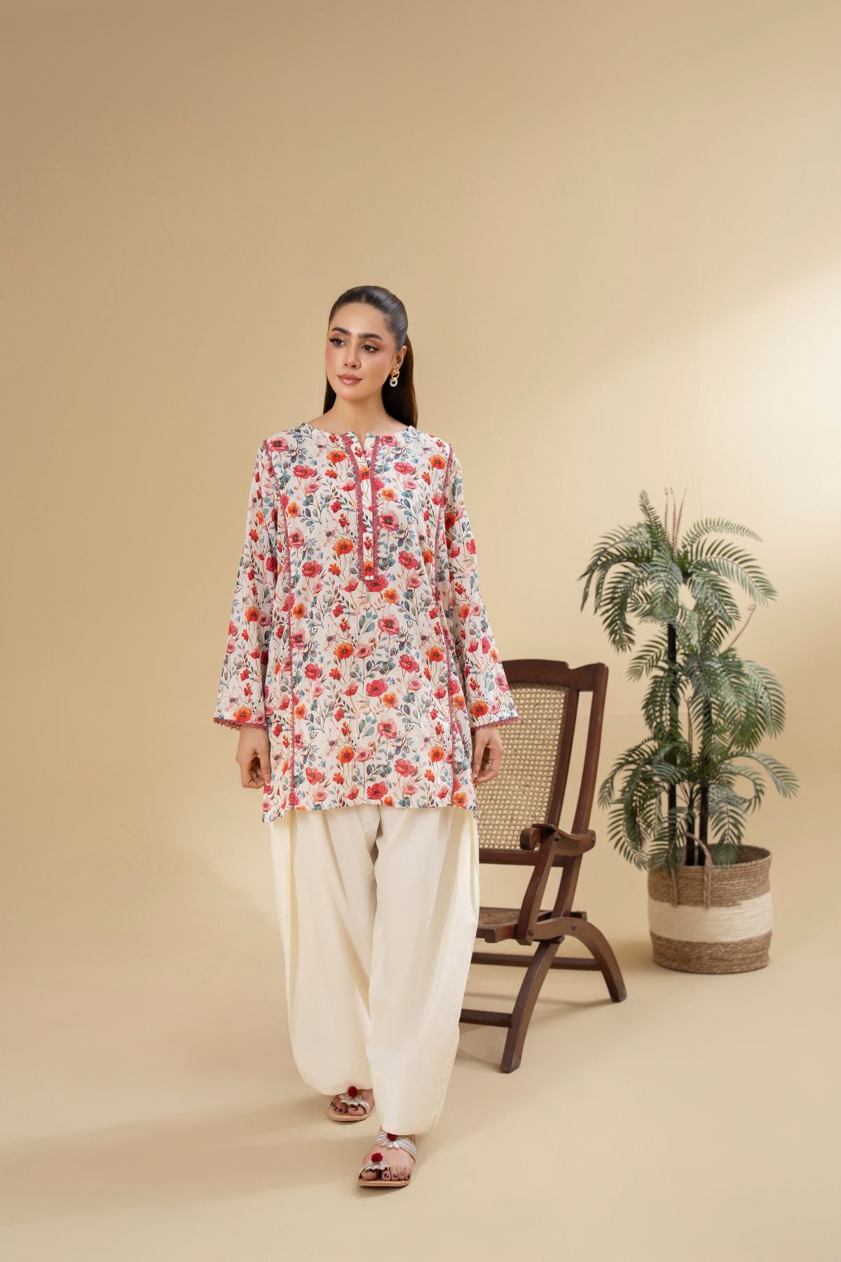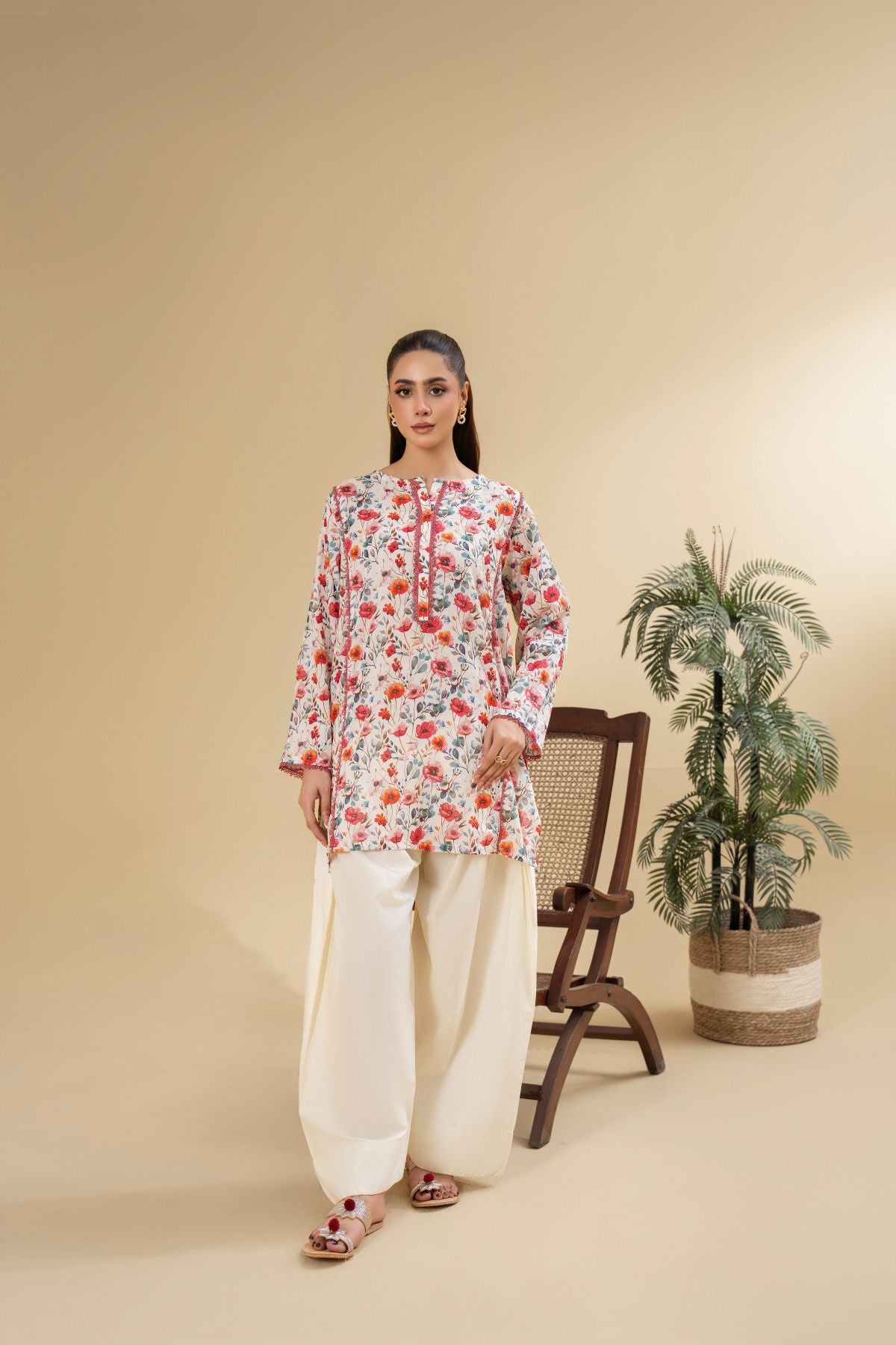 Ignite your style with Electric Blossom, a vivacious display of vibrant hues and playful design. The short kameez boasts an energetic all-over floral print in shades of red, orange, and green, set against a light background, and features a contrasting piped neckline. Paired with elegant off-white shalwar, Electric Blossom is a lively and charming ensemble, perfect for adding a burst of joy to your wardrobe.