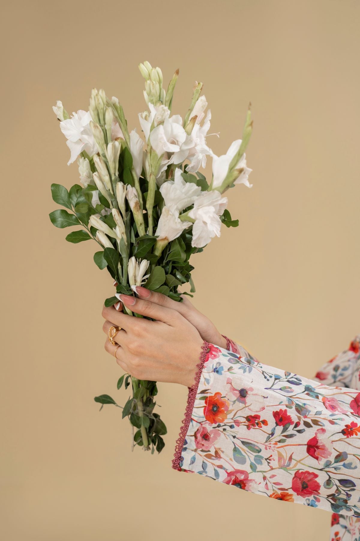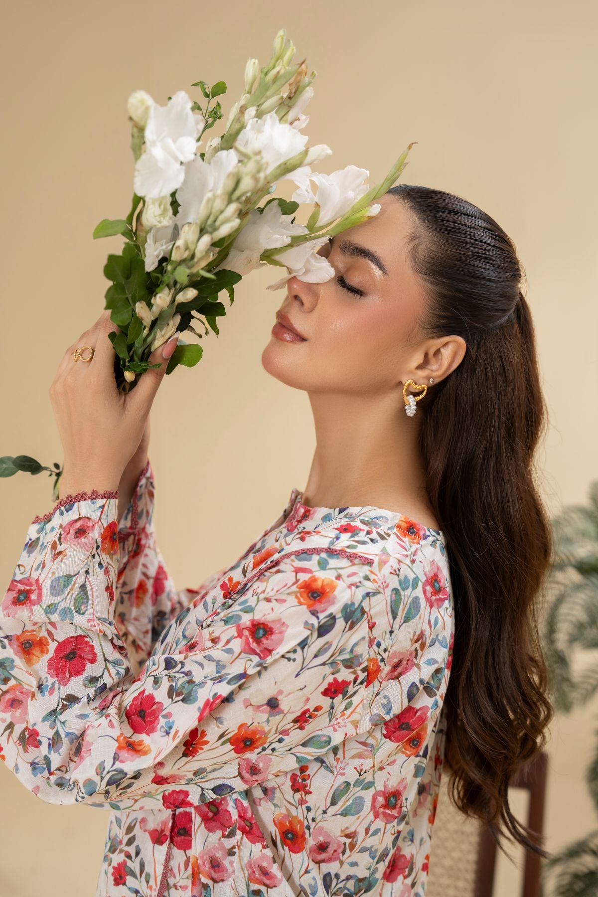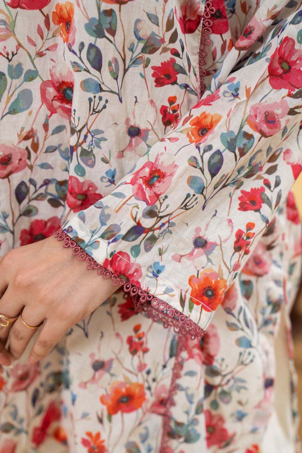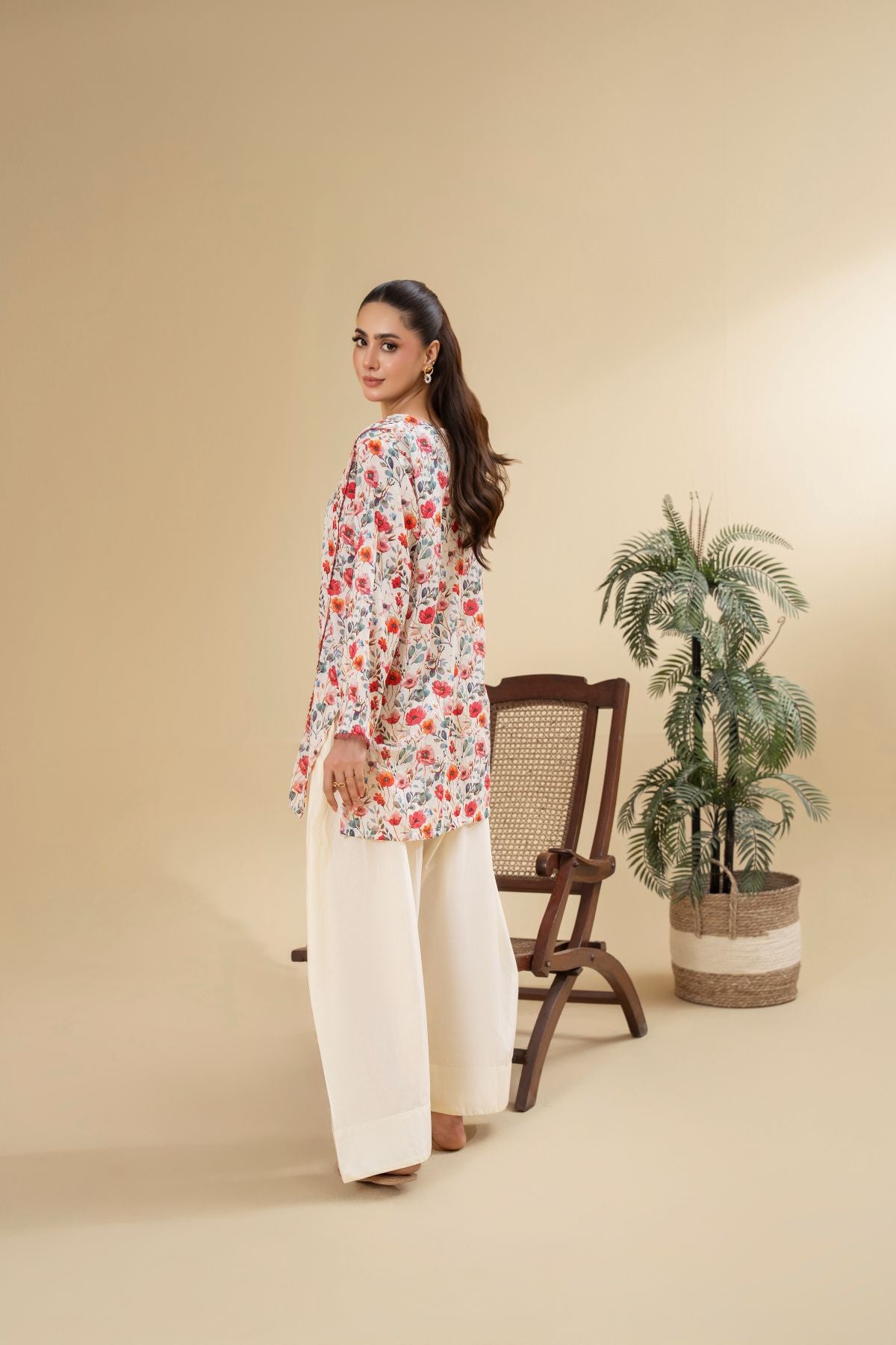 Ignite your style with Electric Blossom, a vivacious display of vibrant hues and playful design. The short kameez boasts an energetic all-over floral print in shades of red, orange, and green, set against a light background, and features a contrasting piped neckline. Paired with elegant off-white shalwar, Electric Blossom is a lively and charming ensemble, perfect for adding a burst of joy to your wardrobe.