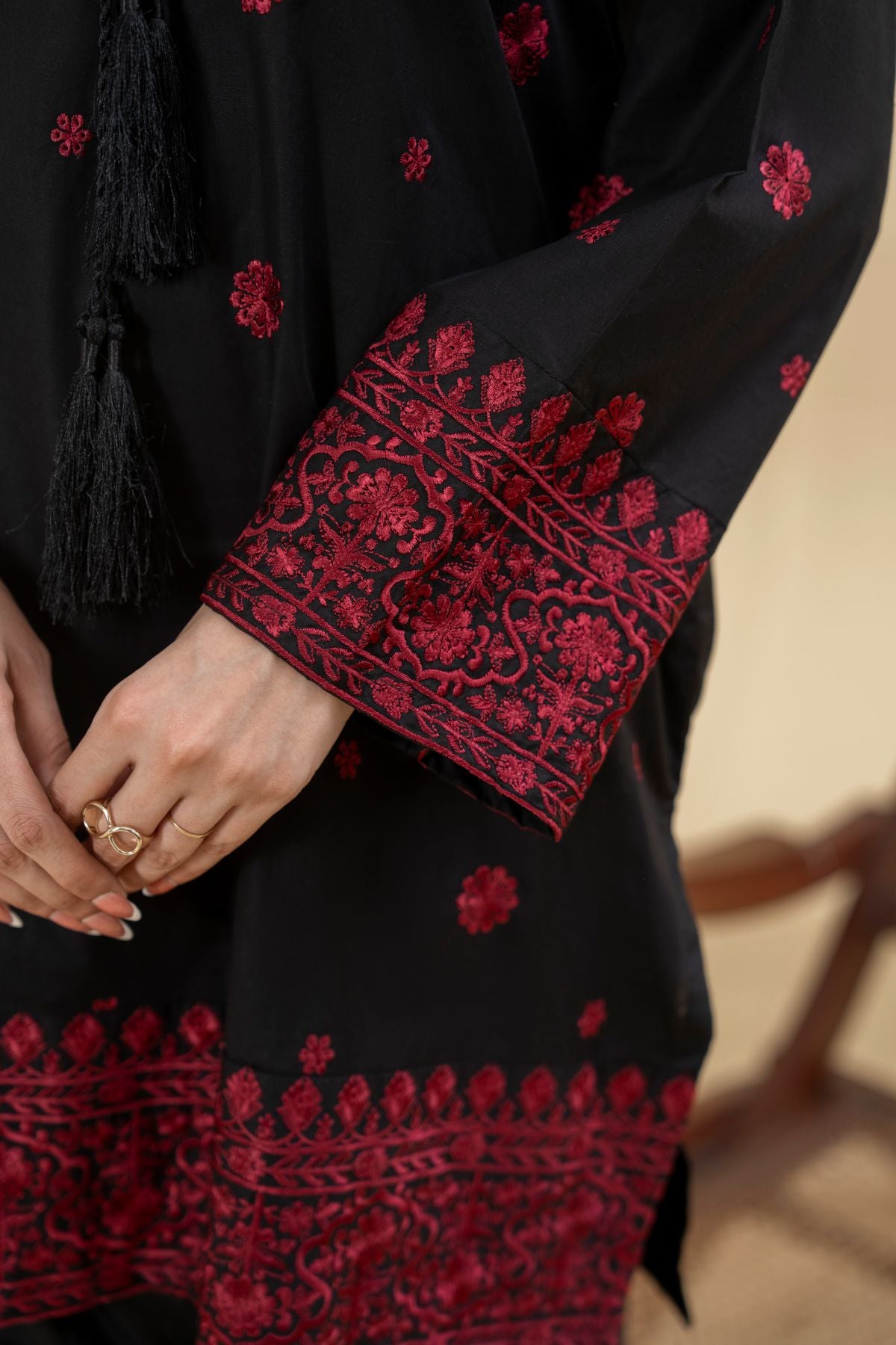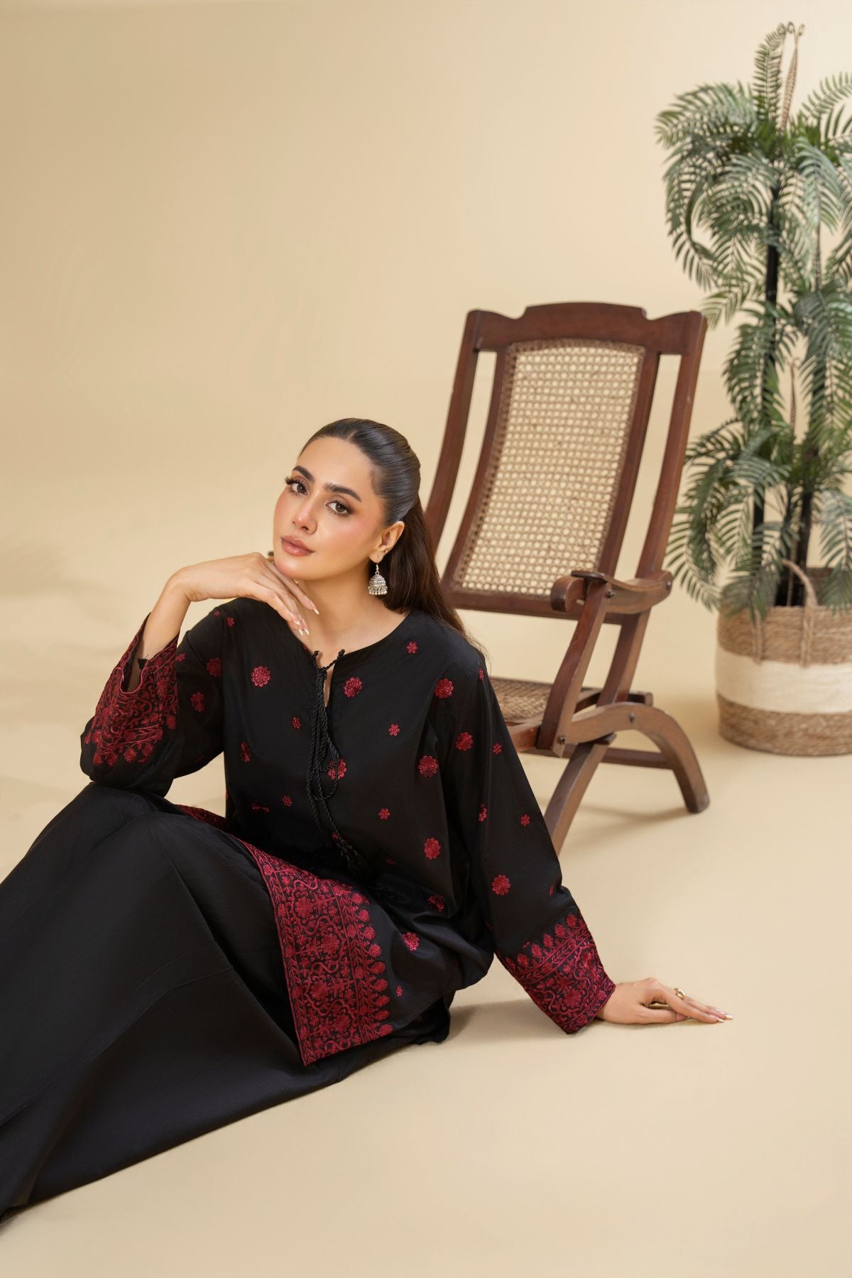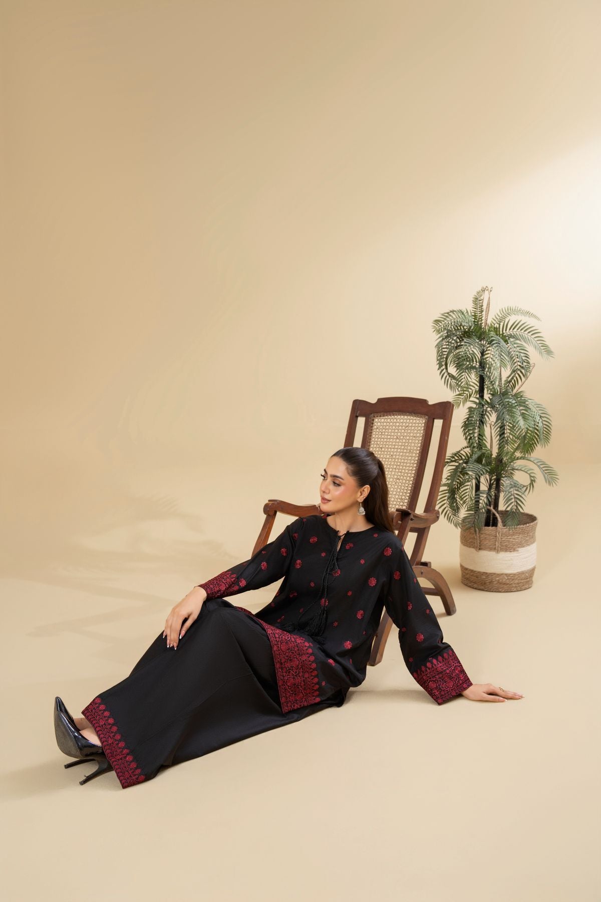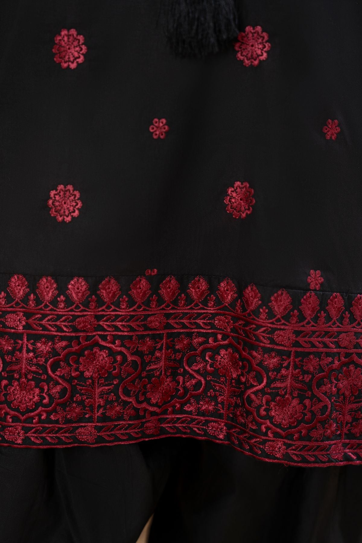 Unveil the captivating allure of Midnight Silhouette, a striking blend of profound black and rich maroon. The kameez is elegantly adorned with intricate maroon embroidery, creating a beautiful contrast against the dark canvas. Paired with matching black shalwar, subtly enhanced with coordinating embroidery. Midnight Silhouette exudes sophistication and timeless presense.