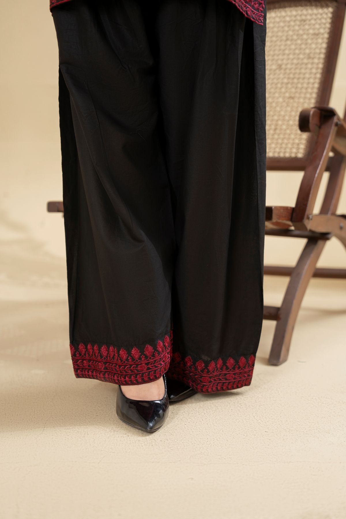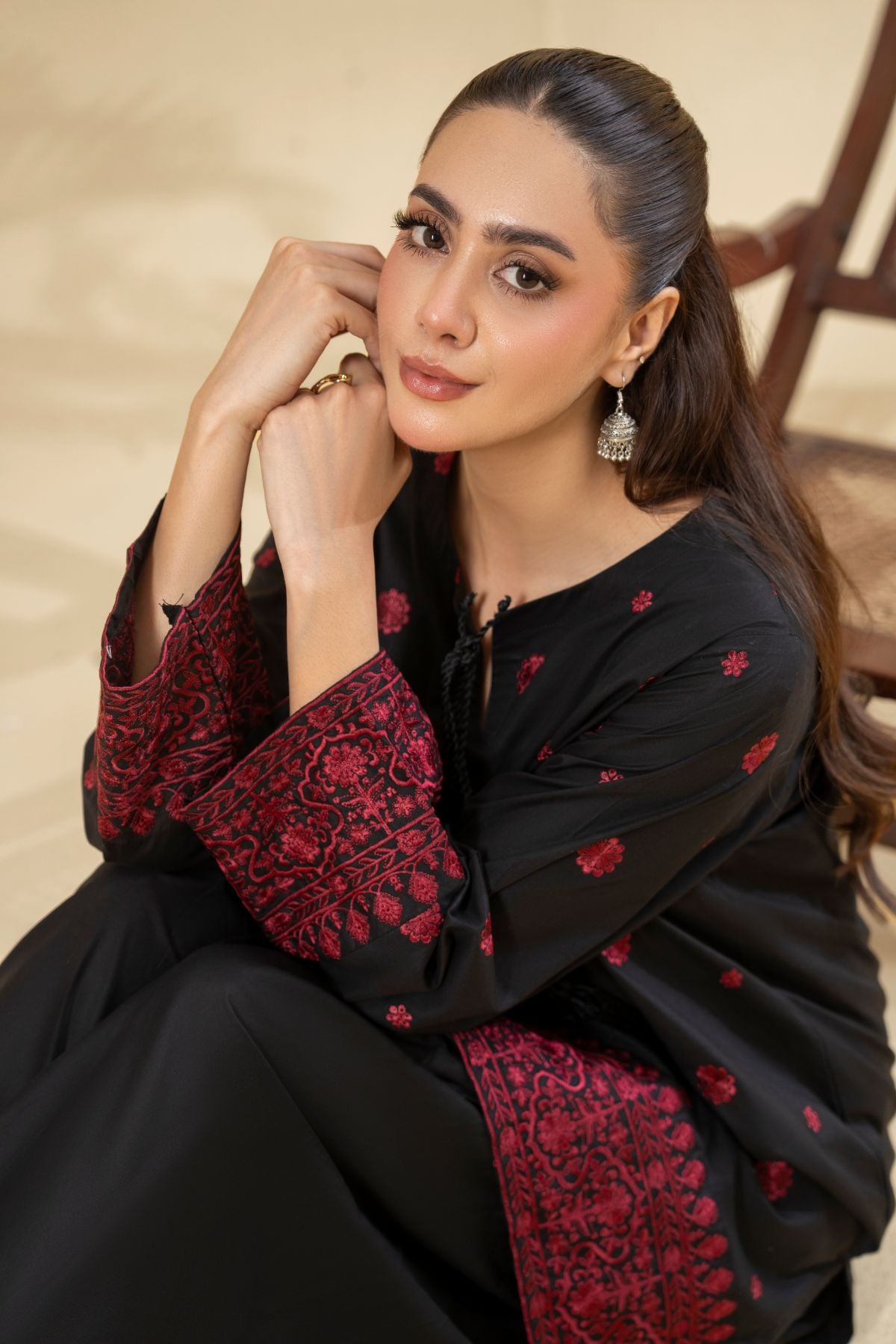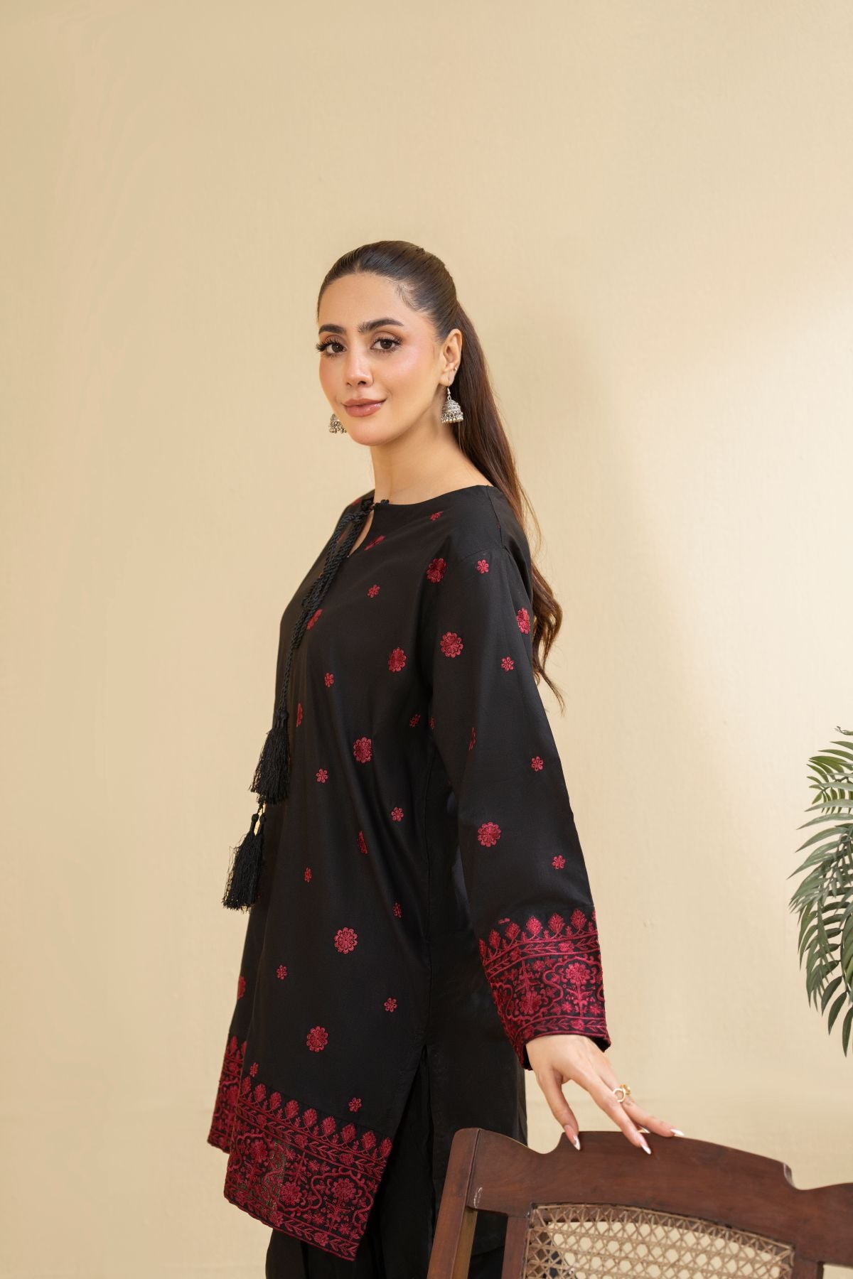 Unveil the captivating allure of Midnight Silhouette, a striking blend of profound black and rich maroon. The kameez is elegantly adorned with intricate maroon embroidery, creating a beautiful contrast against the dark canvas. Paired with matching black shalwar, subtly enhanced with coordinating embroidery. Midnight Silhouette exudes sophistication and timeless presense.