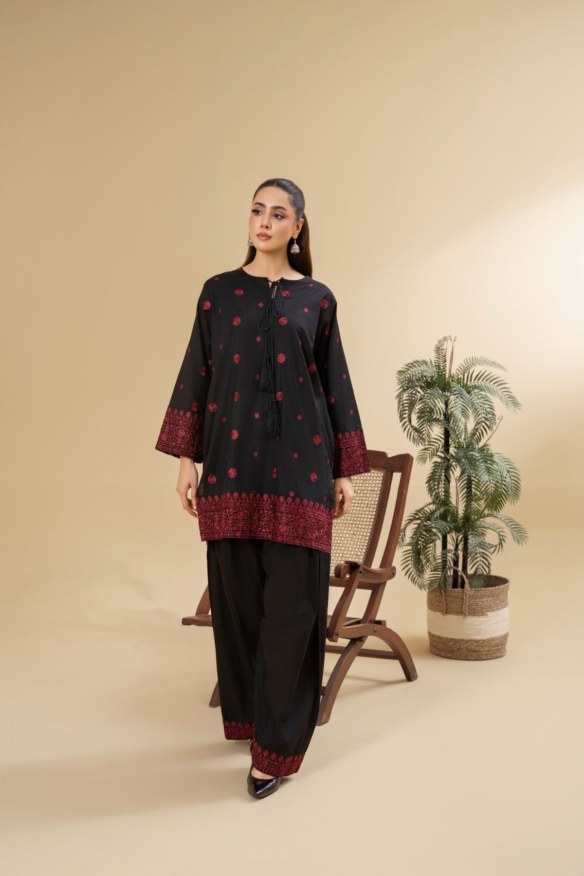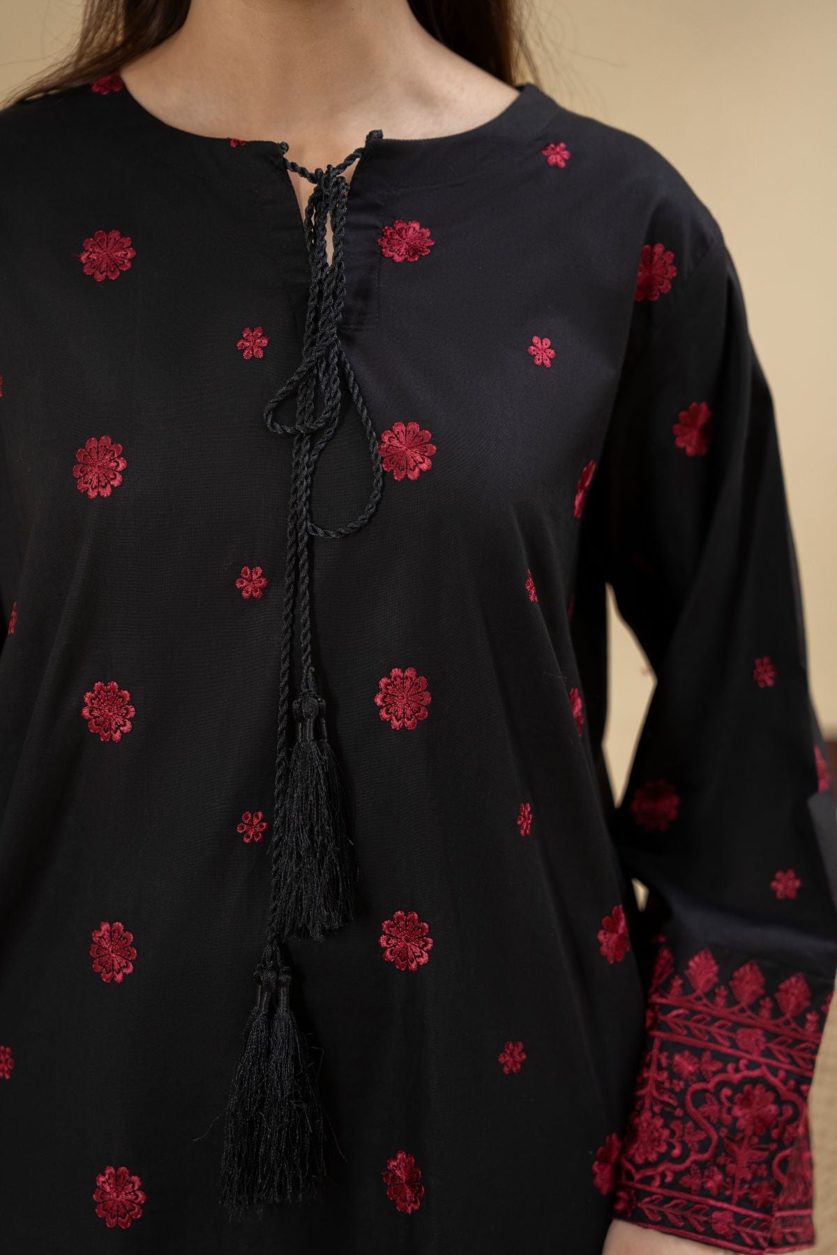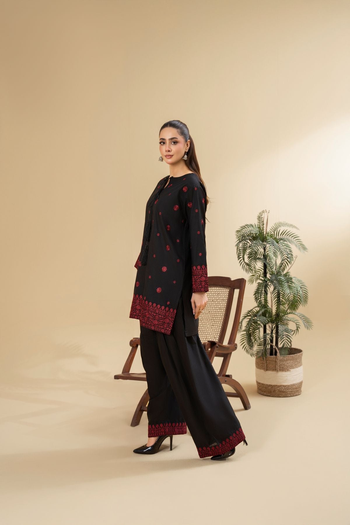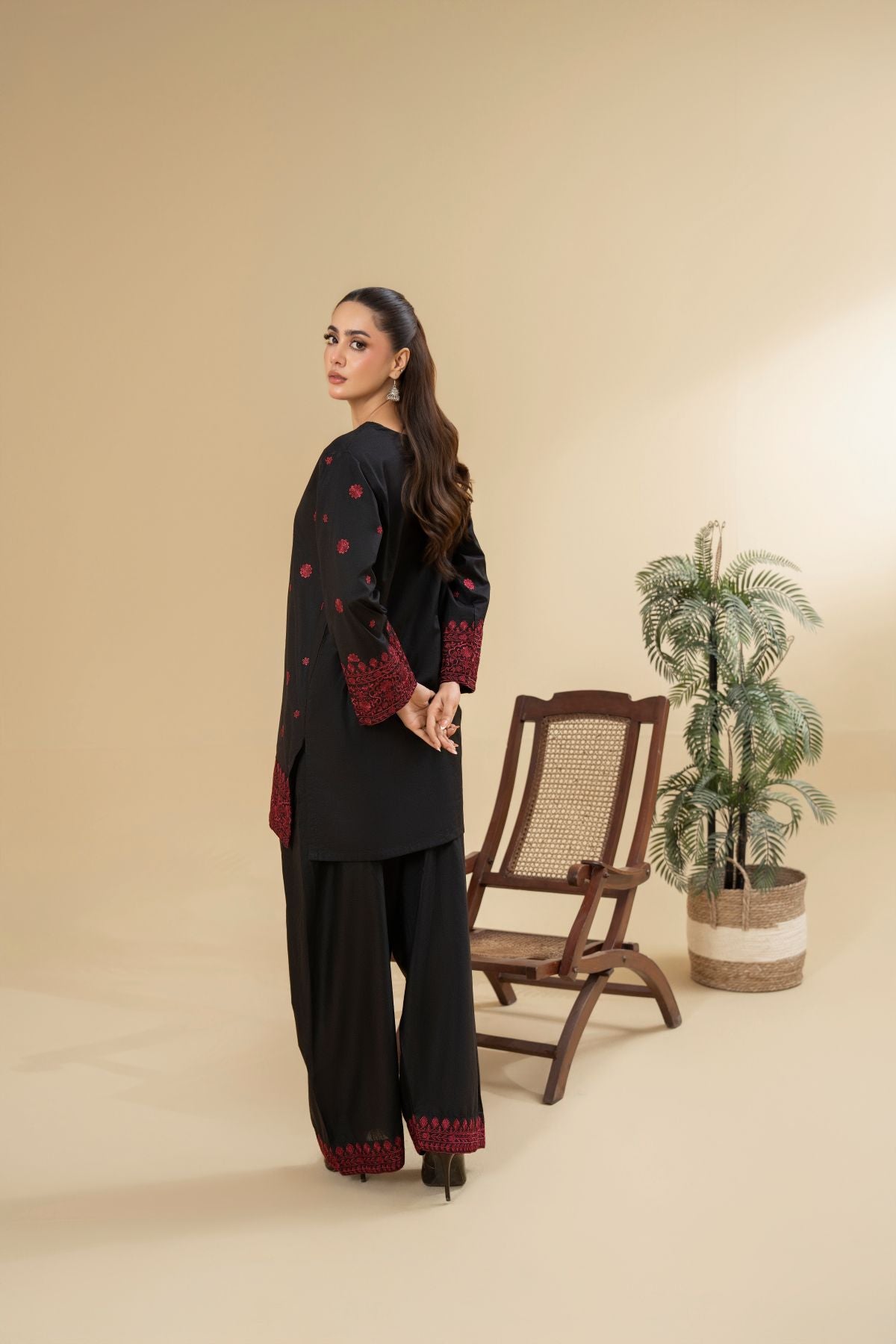 Unveil the captivating allure of Midnight Silhouette, a striking blend of profound black and rich maroon. The kameez is elegantly adorned with intricate maroon embroidery, creating a beautiful contrast against the dark canvas. Paired with matching black shalwar, subtly enhanced with coordinating embroidery. Midnight Silhouette exudes sophistication and timeless presense.