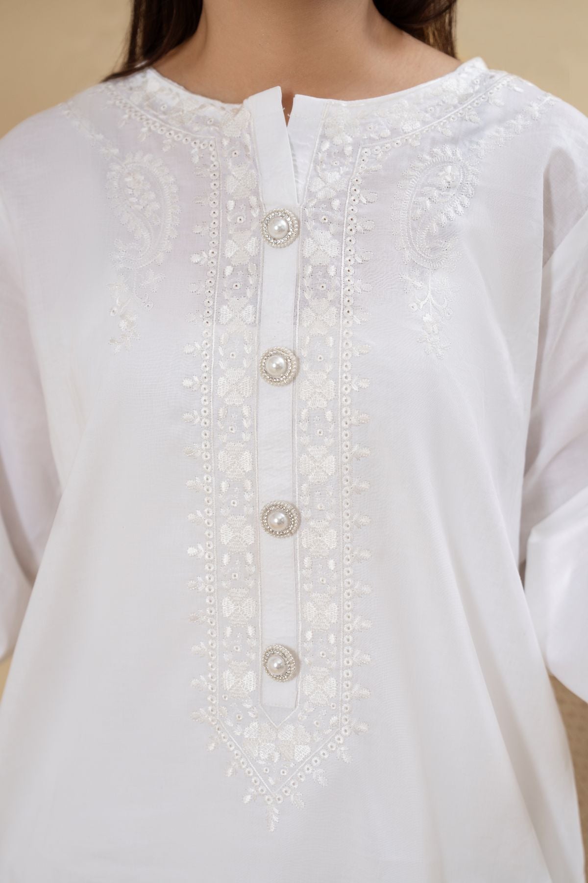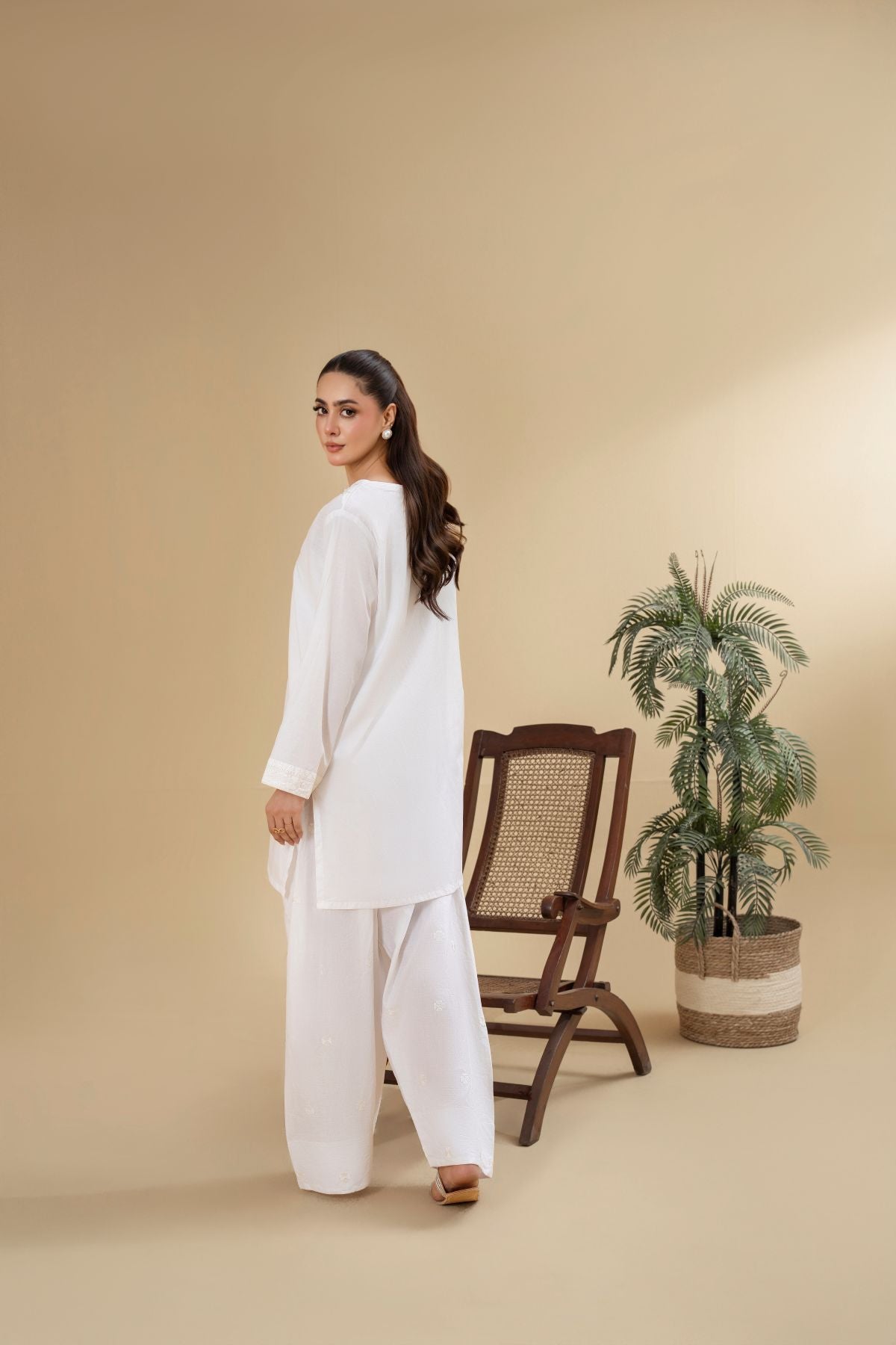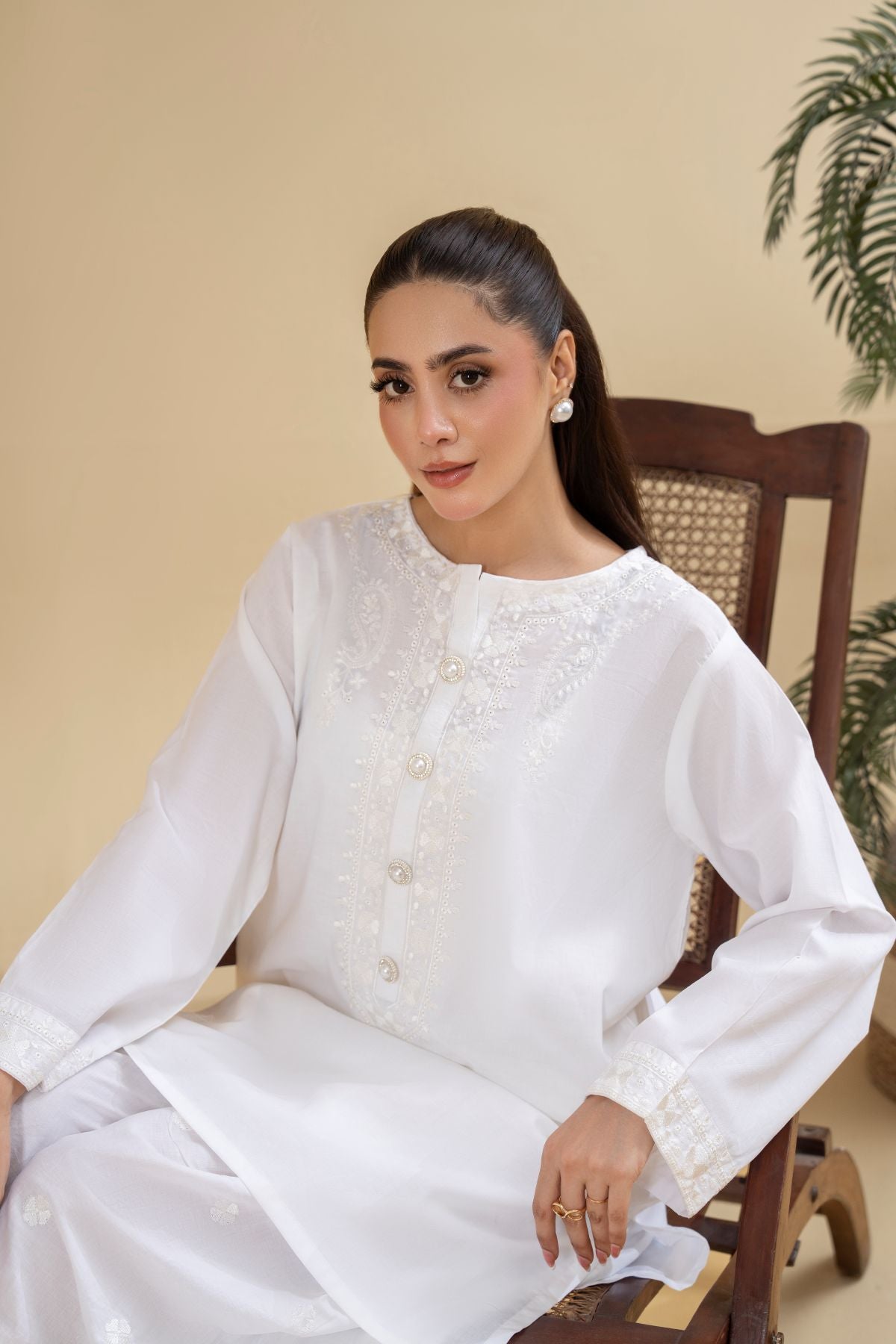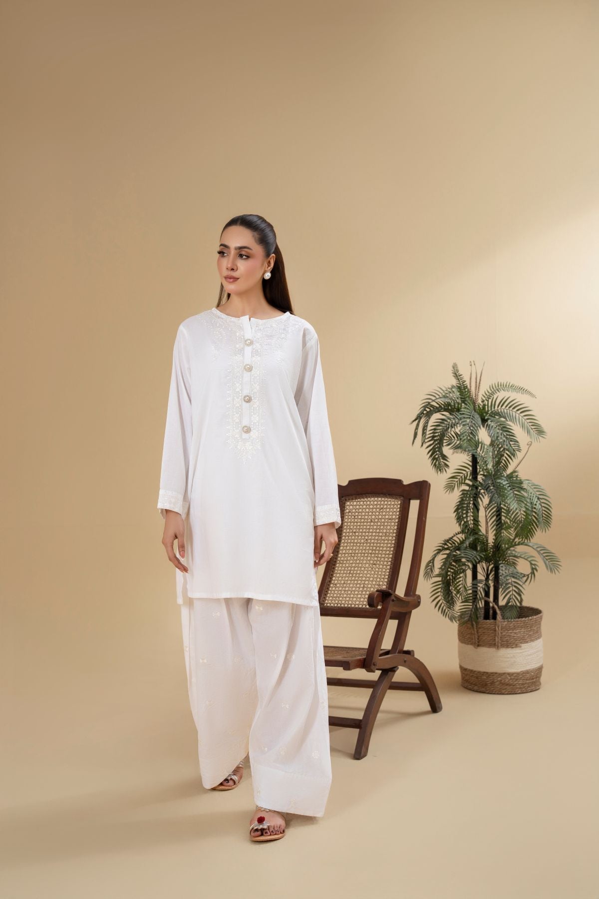 Discover timeless purity with Pearl Halo, an ethereal all-white ensemble. The subtly textured shirt features delicate detailing around the neckline and button placket, exuding a refined elegance. Paired with beautifully embroidered wide-leg shalwar, Pearl Halo offers a serene and sophisticated look, perfect for embracing elegance in its simplest form.