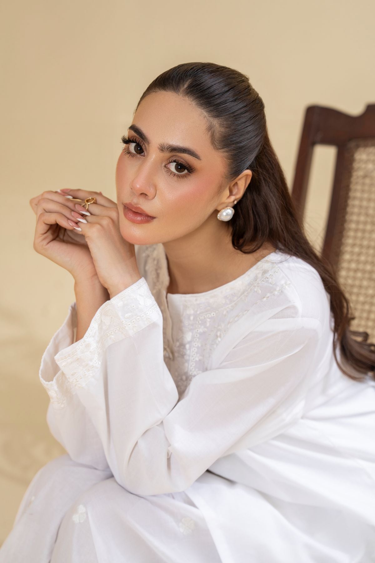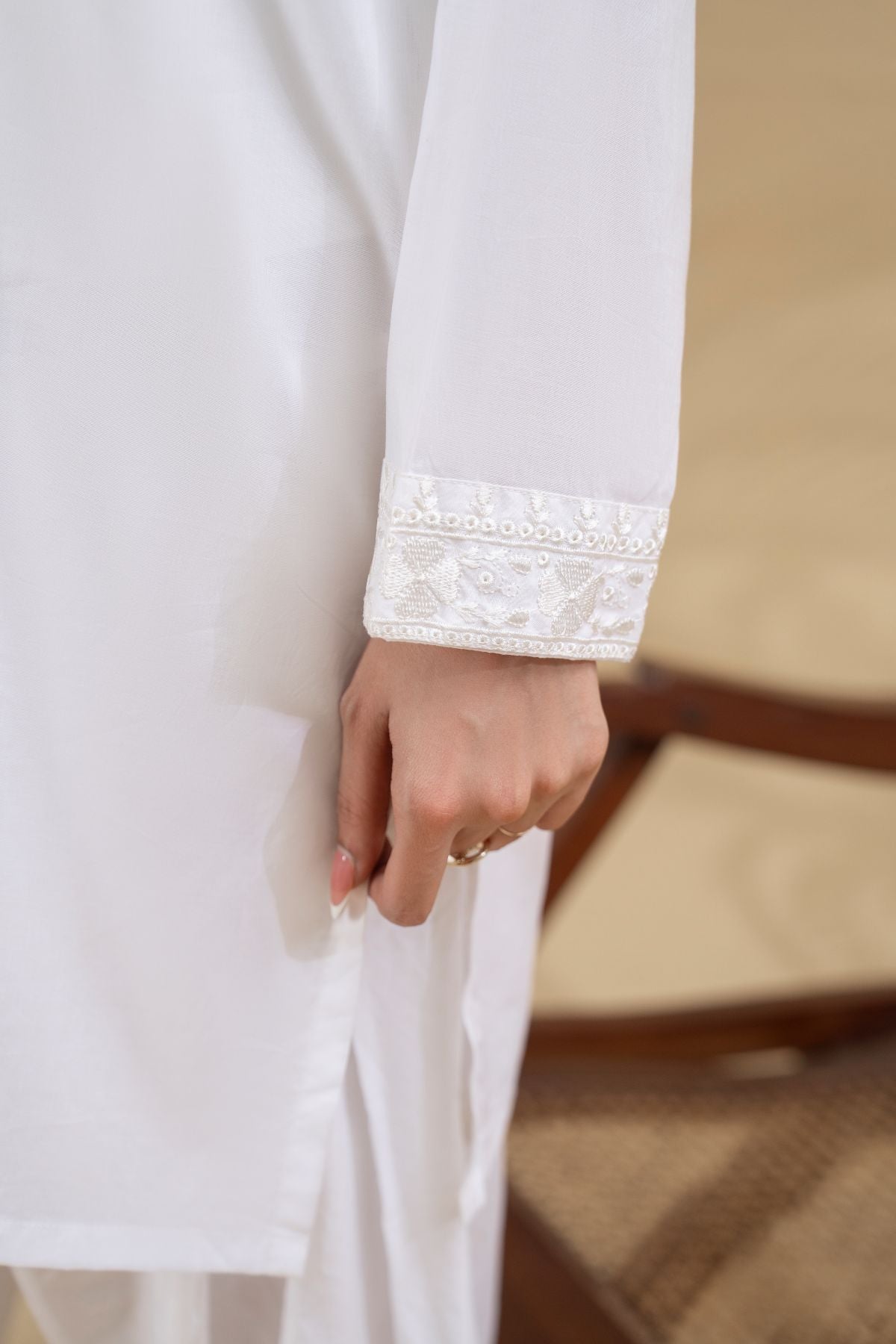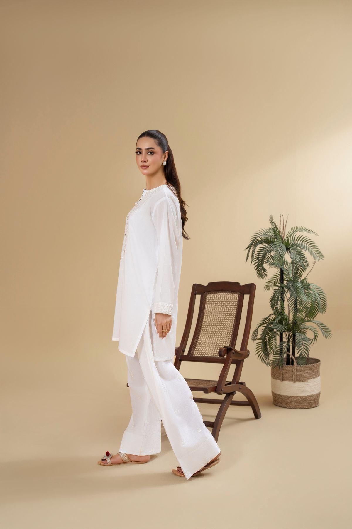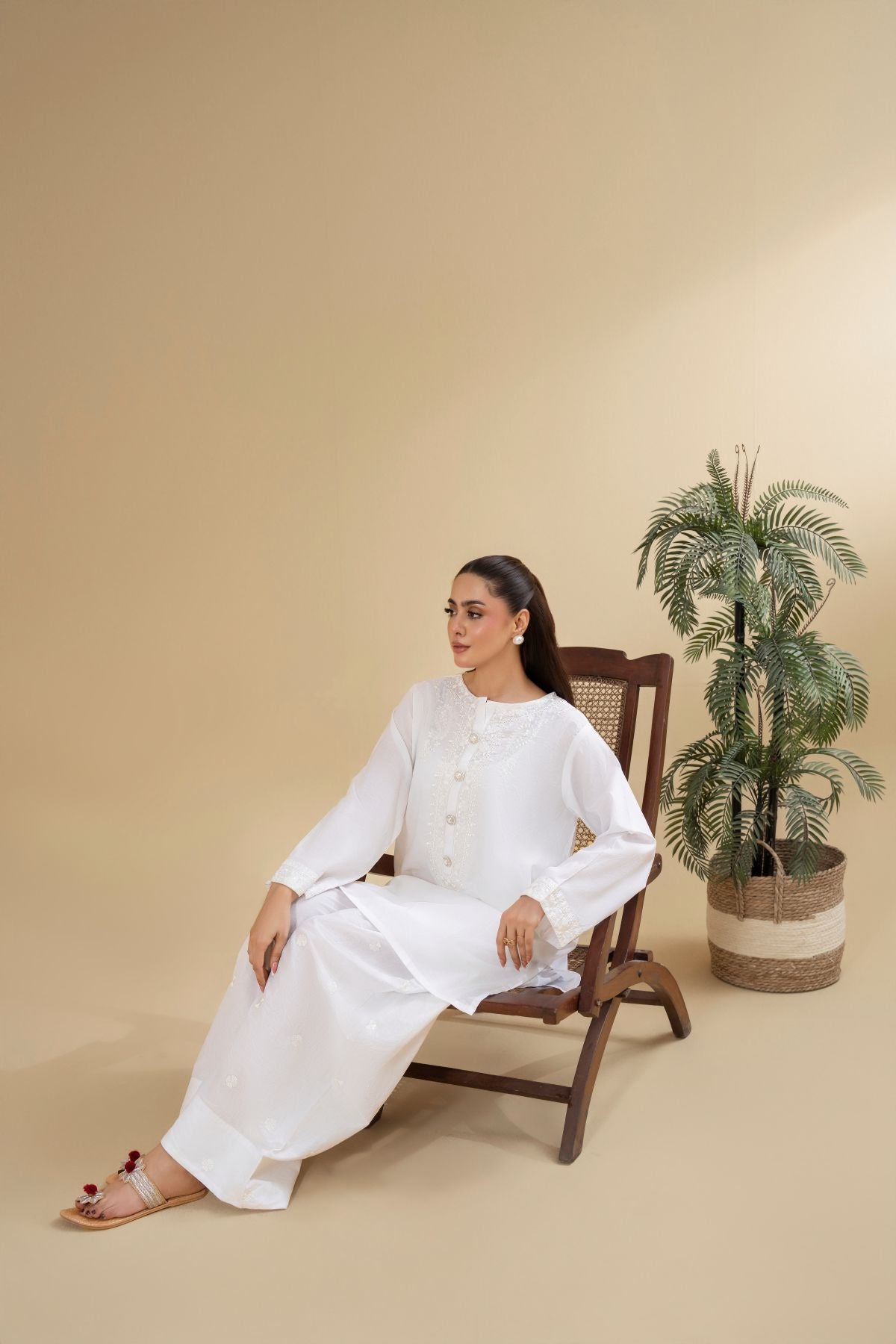 Discover timeless purity with Pearl Halo, an ethereal all-white ensemble. The subtly textured shirt features delicate detailing around the neckline and button placket, exuding a refined elegance. Paired with beautifully embroidered wide-leg shalwar, Pearl Halo offers a serene and sophisticated look, perfect for embracing elegance in its simplest form.