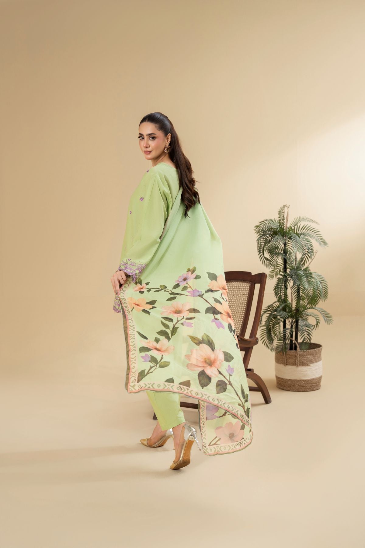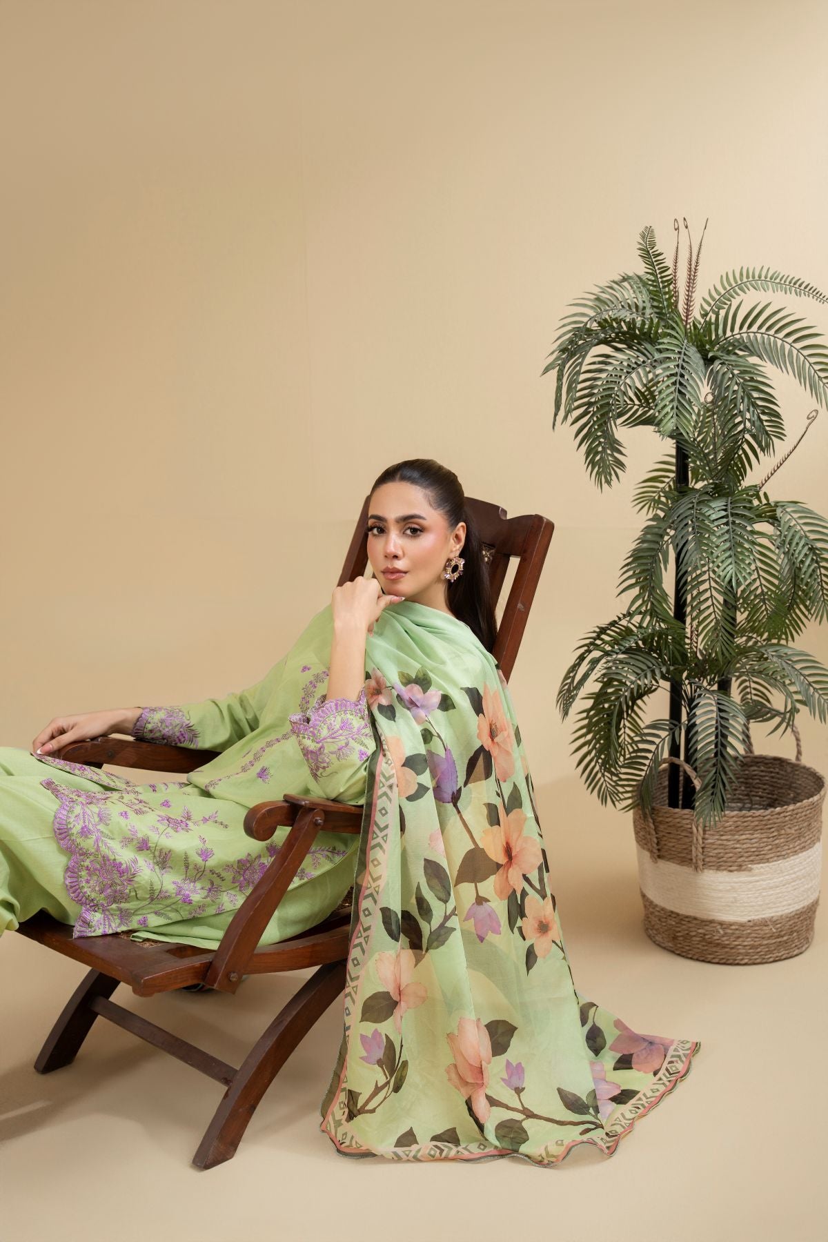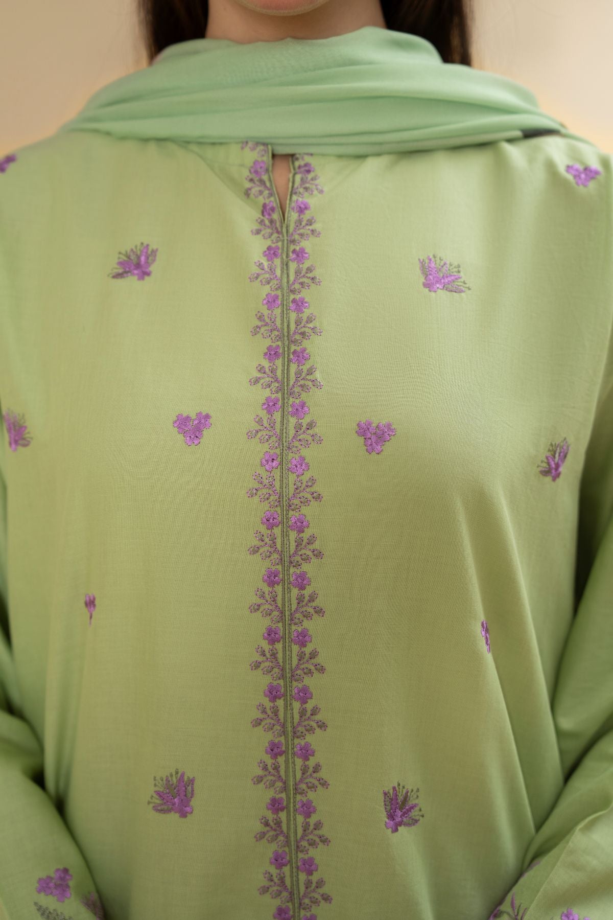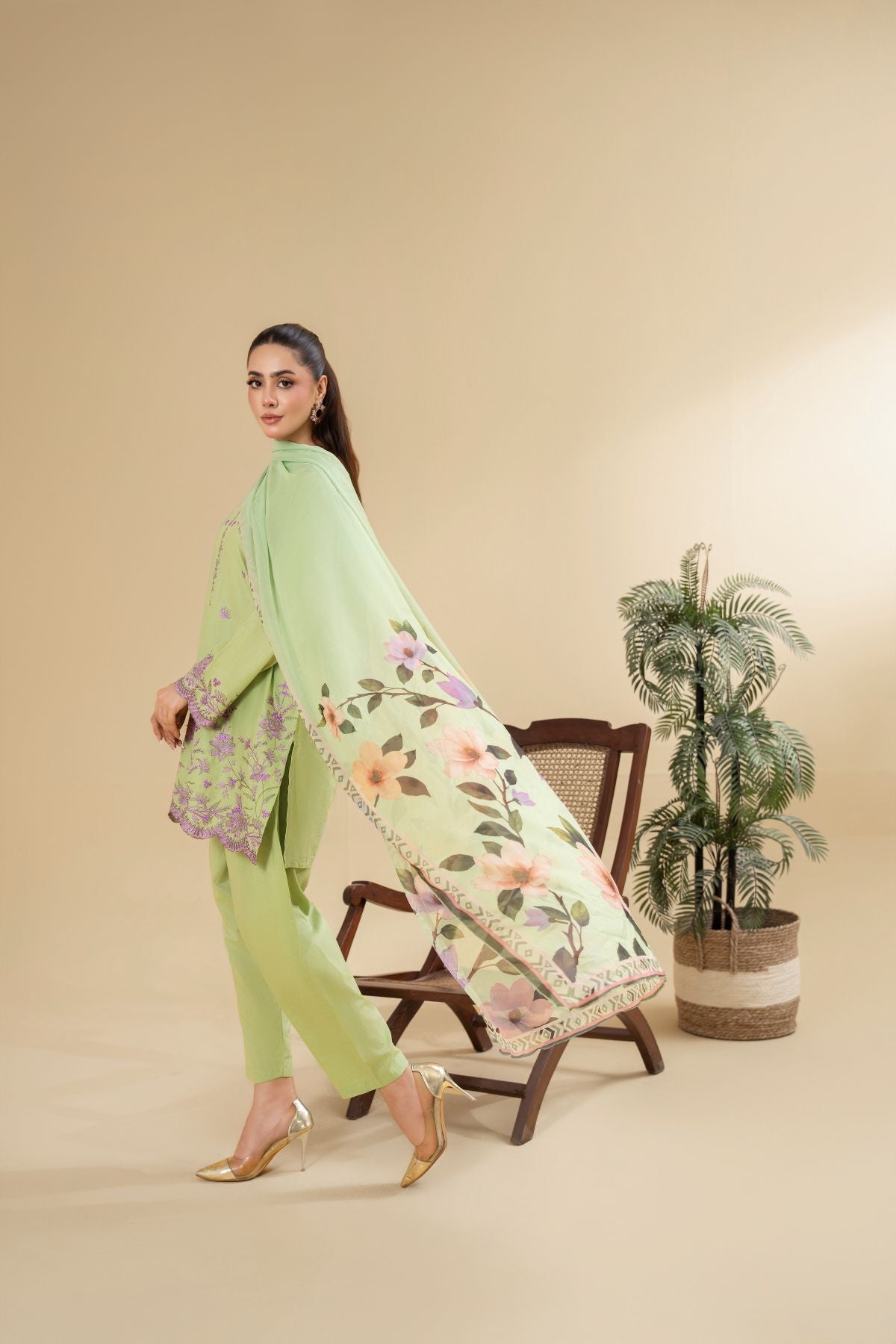 Embrace the refreshing elegance of Pistachio Haze, a symphony of soothing green and delicate lilac. This ensemble features intricate floral embroidery adorning the neckline and sleeves, flowing gracefully onto the kameez border. Paired with a fitted shalwar and a beautiful floral printed silk dupatta. Pistachio Haze offers a sophisticated yet serene look, perfect for any occasion.