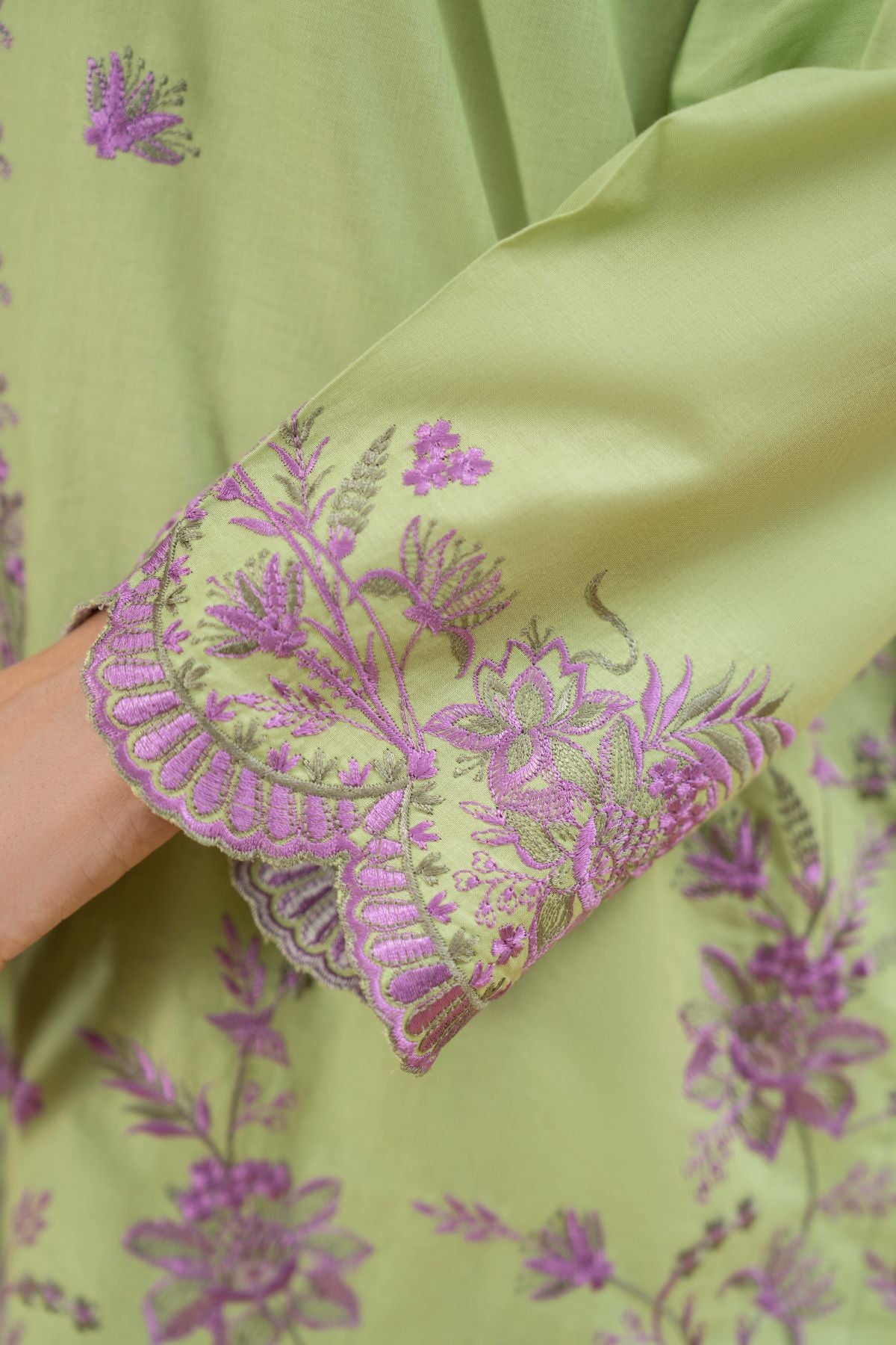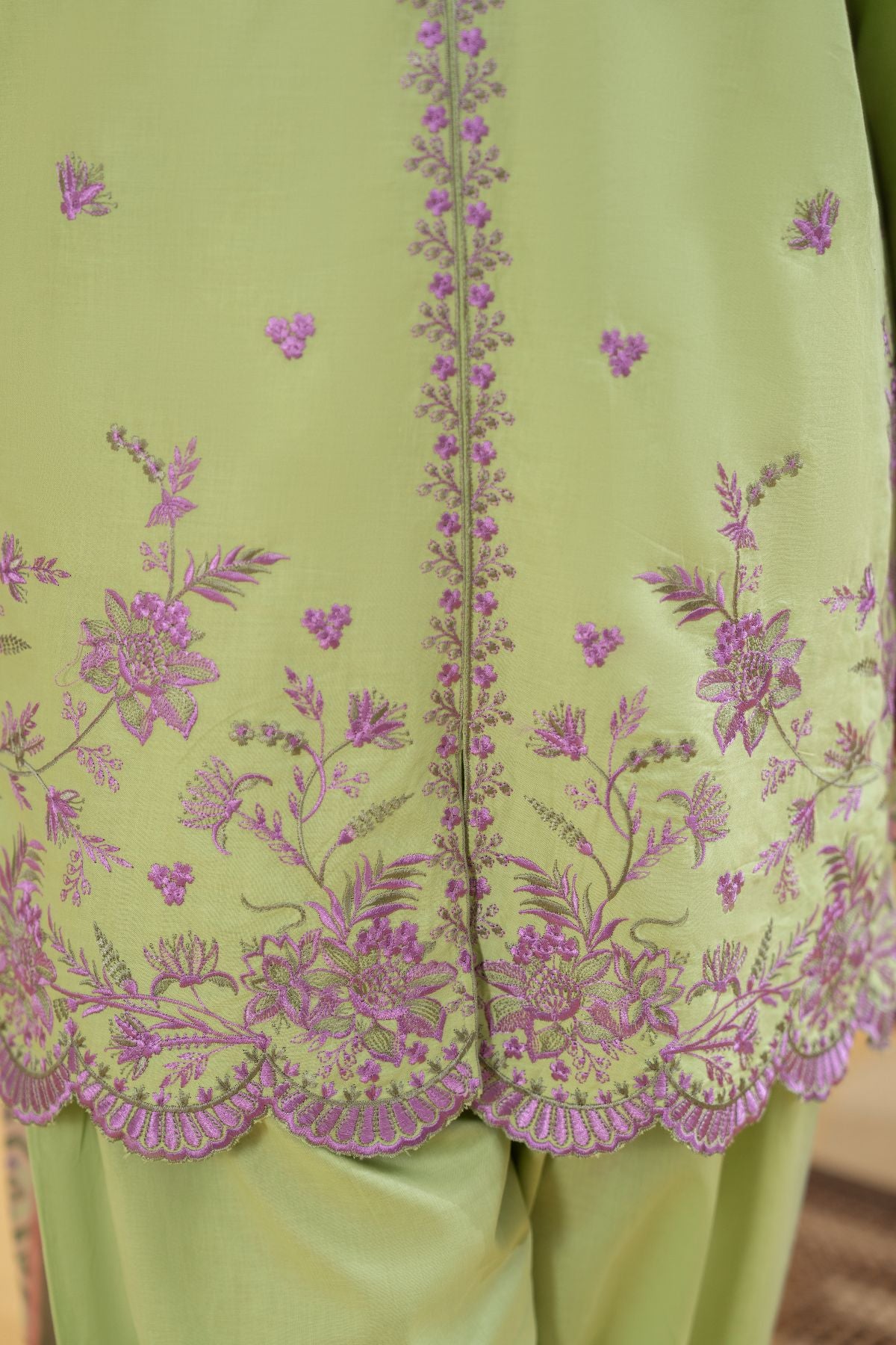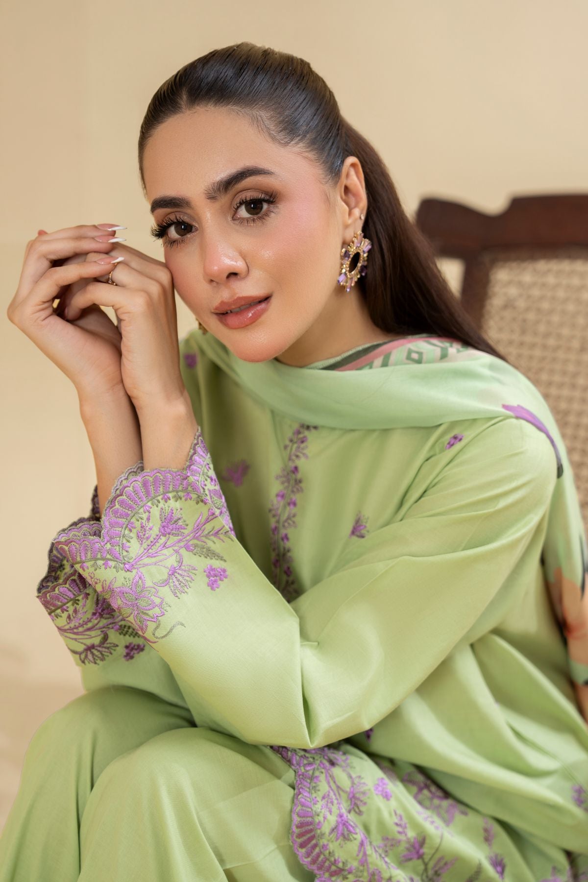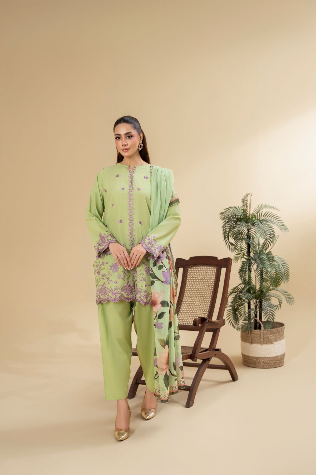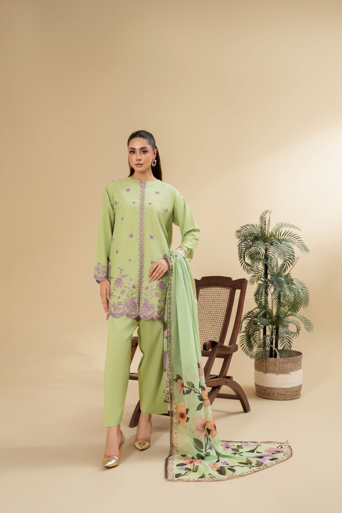 Embrace the refreshing elegance of Pistachio Haze, a symphony of soothing green and delicate lilac. This ensemble features intricate floral embroidery adorning the neckline and sleeves, flowing gracefully onto the kameez border. Paired with a fitted shalwar and a beautiful floral printed silk dupatta. Pistachio Haze offers a sophisticated yet serene look, perfect for any occasion.