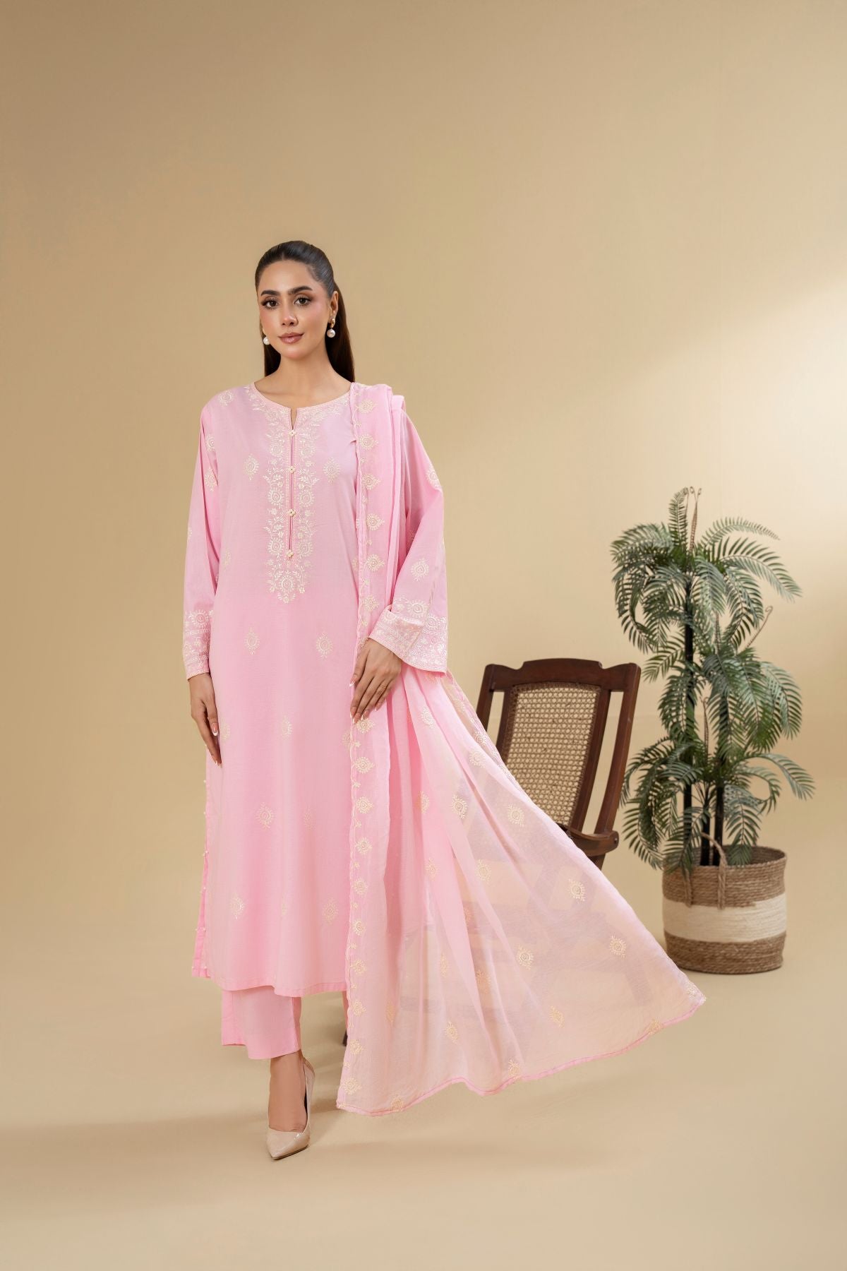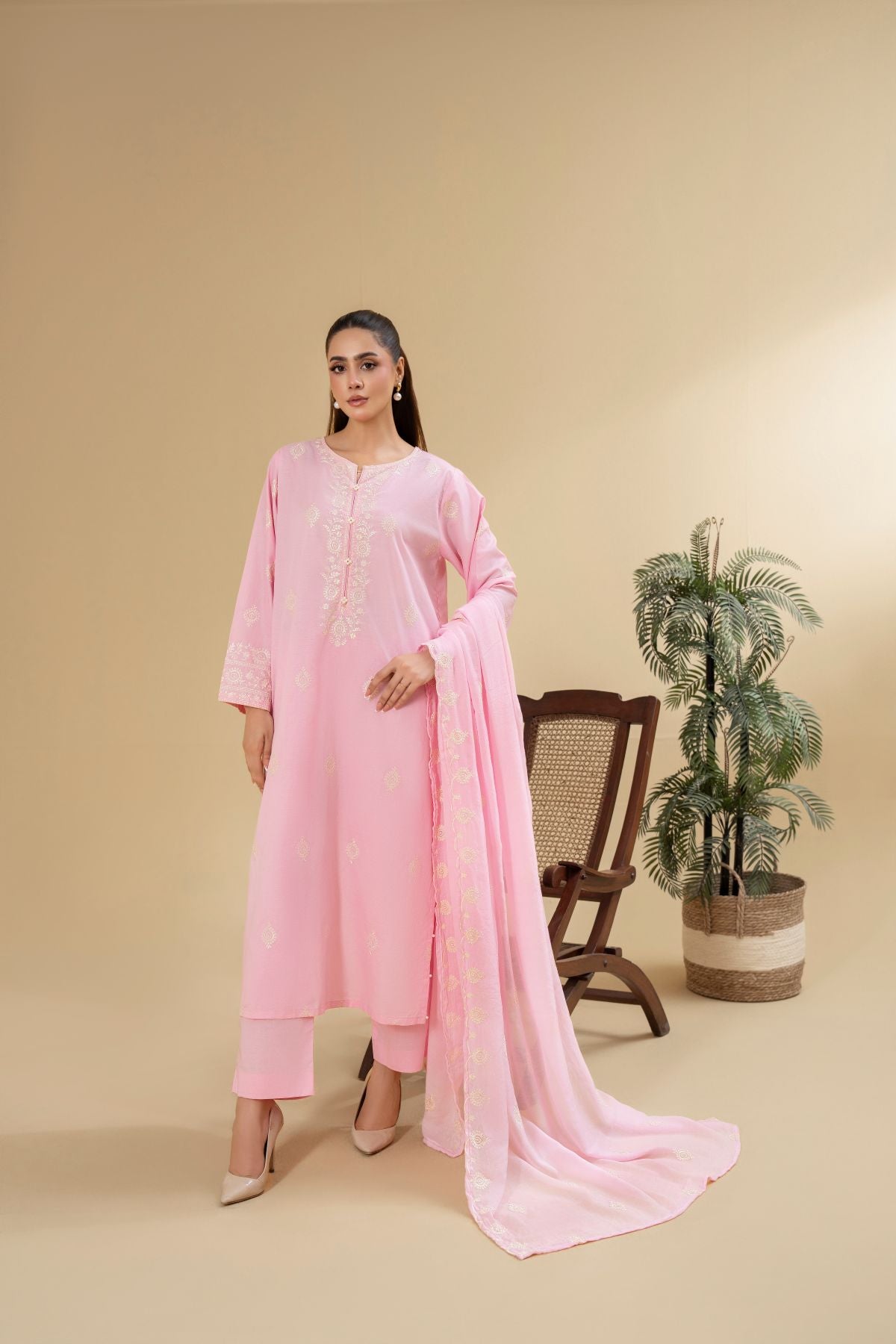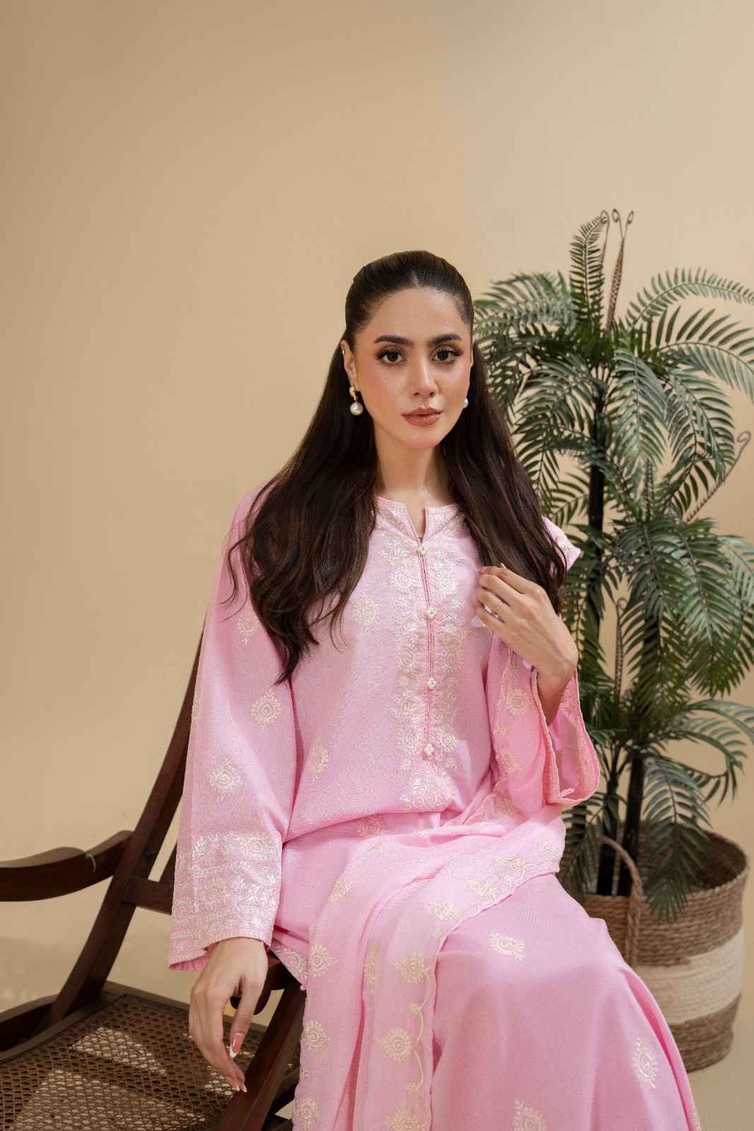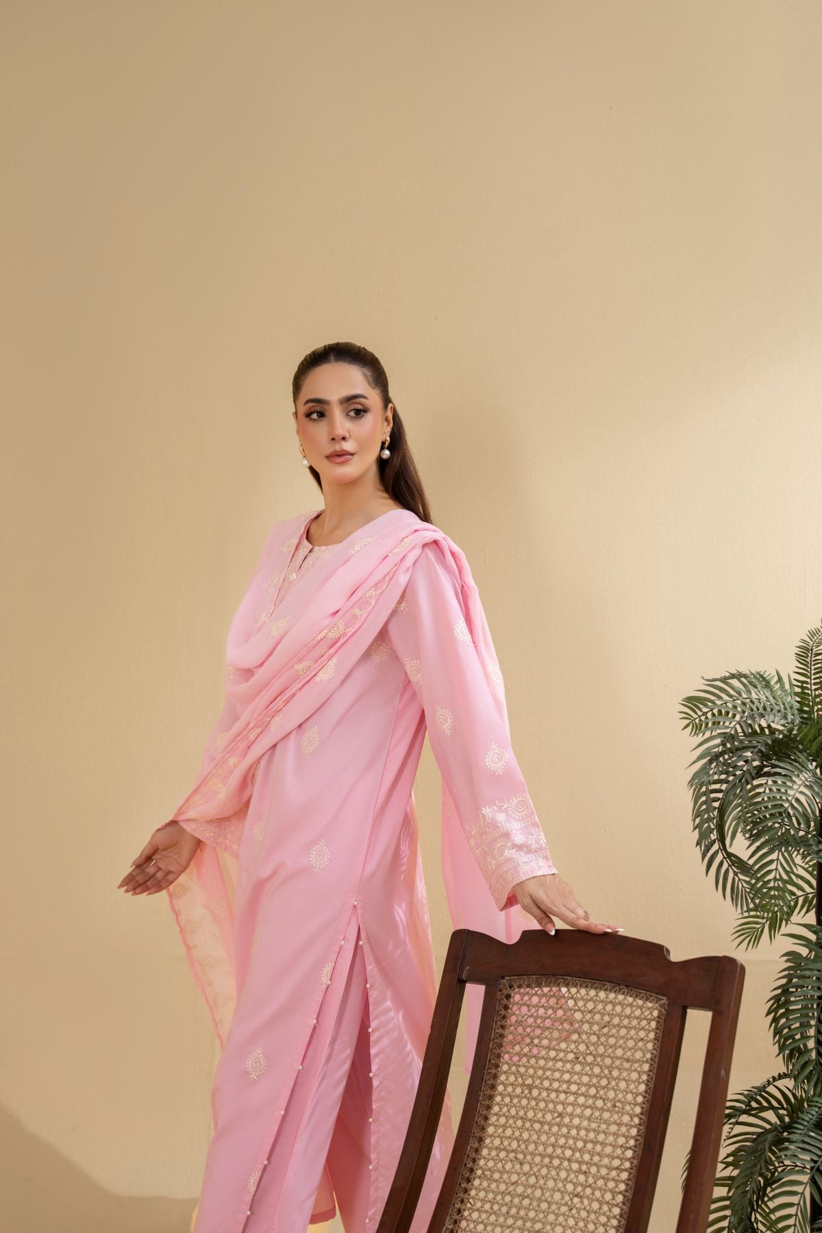 Experience the gentle charm of Soft Petal Glow, a delicate ode to feminine grace. This lovely light pink ensemble features subtle off-white embroidery gracing the neckline and sleeves. Complemented by matching pants and a beautifully embroidered dupatta in harmonious tones. Soft Petal Glow offers a serene and elegant look for any occasion.