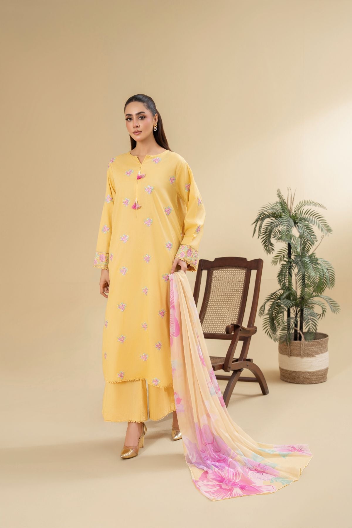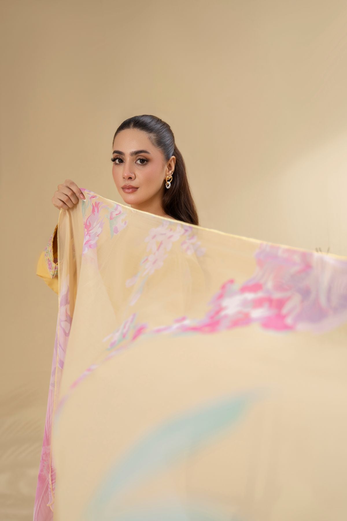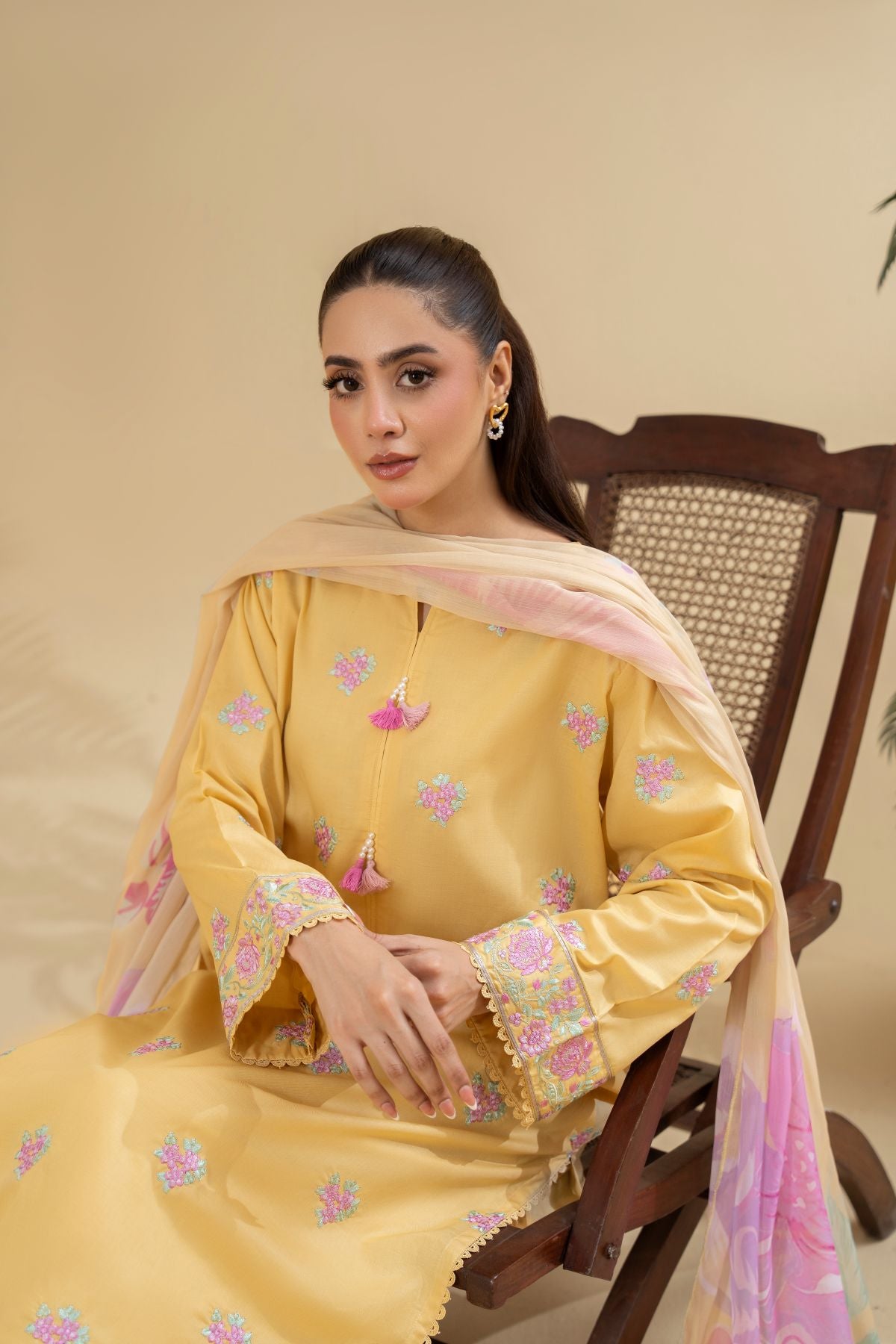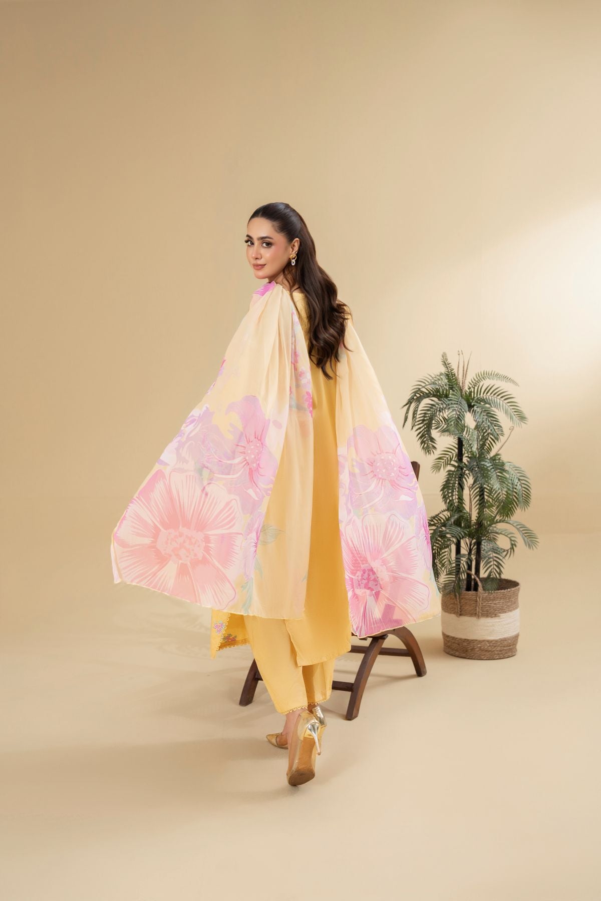 Bask in the radiant glow of Sunray Essence, a vibrant testament to joyful warmth. The sunny yellow kameez features delicate scattered embroidery and tassels at the neckline, creating a cheerful aesthetic. Complemented by loose pants and a sheer floral printed dupatta blooming with soft pink and purple hues. Sunray Essence is designed to illuminate your presence with a captivating charm.